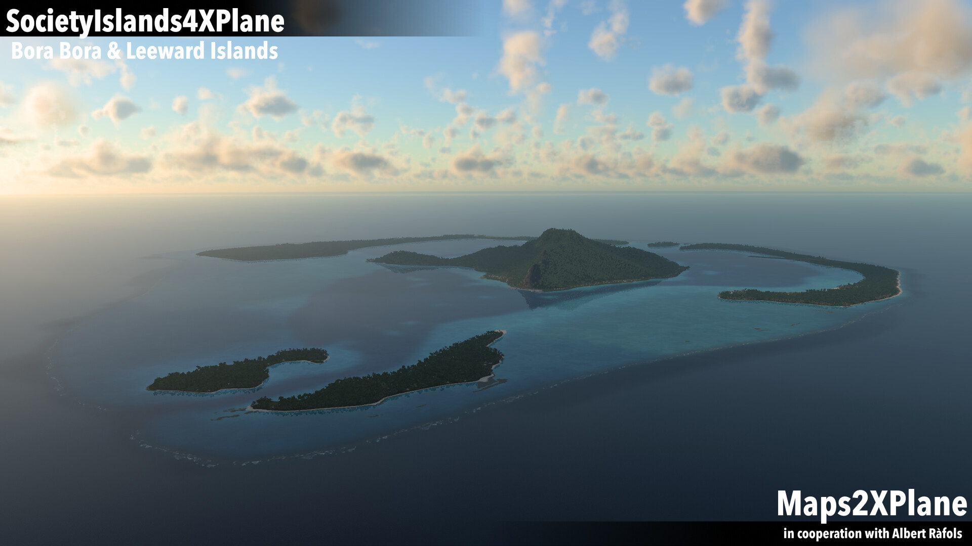 This scenery package for X-Plane features a custom terrain mesh with photo-realistic textures, dense vegetation and country-typical autogen, as well as custom road-networks and sea-routes. Included are detailed renditions of five regional airports (Bora Bora, Raiatea, Huahine – Fare, Maupiti, Tupai) and the Pago dropzone of Tahiti Nui Helicopters on Bora Bora, as well as five additional helipads.