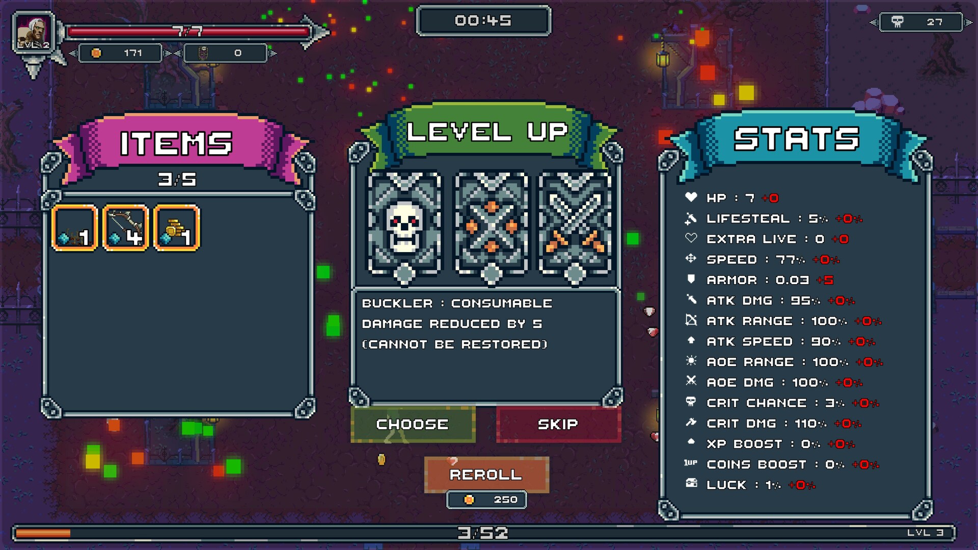 Shoot through the hordes with different weapons and add new weapons by leveling up your hero. Choose from three different items which randomly be chosen per level up where each can be one of three item types, a consumable, a weapon or a stats modifying item. In addition the items have a rarity attribute which defines their strength of enhancement and if you are lucky you might find a legendary item. Stash them into your inventory but choose wisely as you dont have infinite space in your backback and they are not interchangeable but you can skip or reroll the items if they do not fit your playstyle. You can also reroll if you want a specific item, want to build for a specific playstyle or you just had bad luck but as usual nothing comes without a cost. And in the main menu item shop you can increase your inventory space by simply buying a backpack.