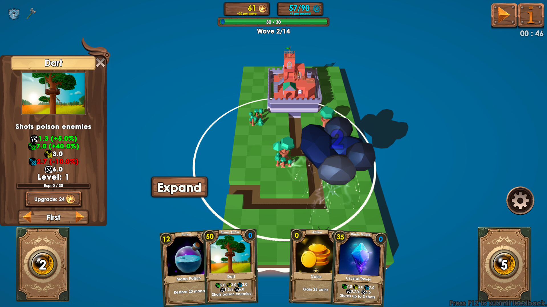 Begin your turn by expanding land. Each game you will create a completely different map. Each land expansion may come with a variety of different terrain, on which your towers will get different bonuses. You can get more damage, attack speed or range depending on where you choose to place your tower.