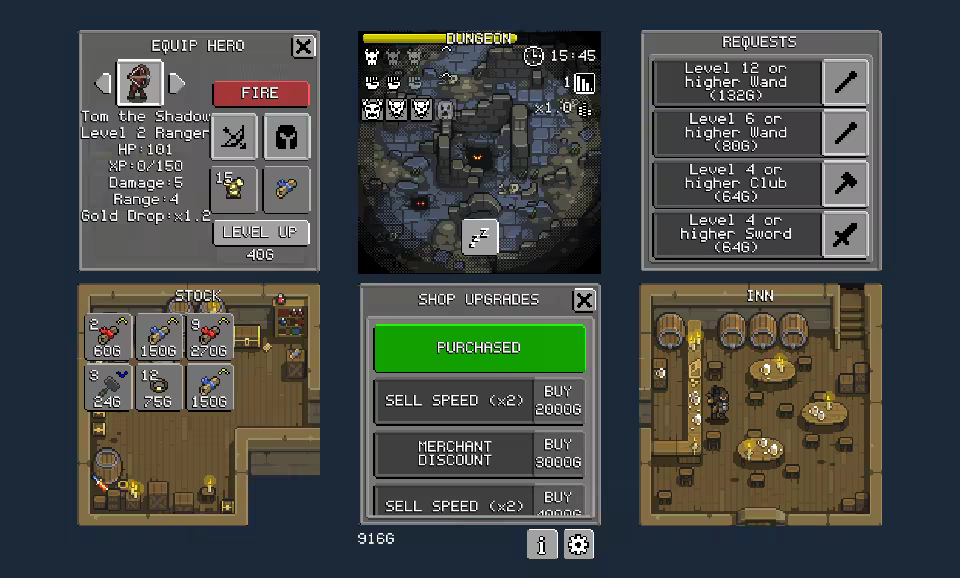 Buy and sell weapons, armour, potions and more to grow your humble shop. Hire adventurers and send them into the dungeon to collect loot for you. You've got a debt to pay to the king and in order to pay it, you're going to have to buy low, sell high and hope your hired heroes make it out alive.