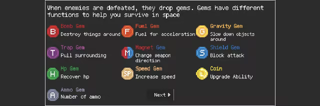 • Different gems drops from enemies help you survive in space