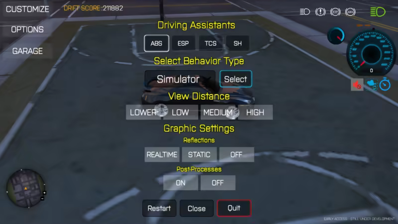 Drift City is an Open World Driving Drifting Sim with Deep Car Customization such as Speed, Suspension, different driving system and styles and much more which you can read down below. There are 8 cars that can be unlocked for the Early Access and we will add at least 20 cars to the game. It has 6 different cameras/views to see the car and play. There are also Slow-motion and Nitro for all cars available. It has a mini-map so you can see where you go and what you will face and amazing music that can be muted if you wish. More in detail down below.