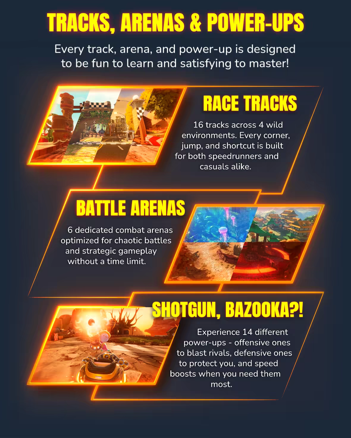 The Early Access version already includes the full core content—every race track, battle arena, and game mode. During Early Access, we’ll focus on completing these two big features, polishing the game, and adding even more content and game modes.