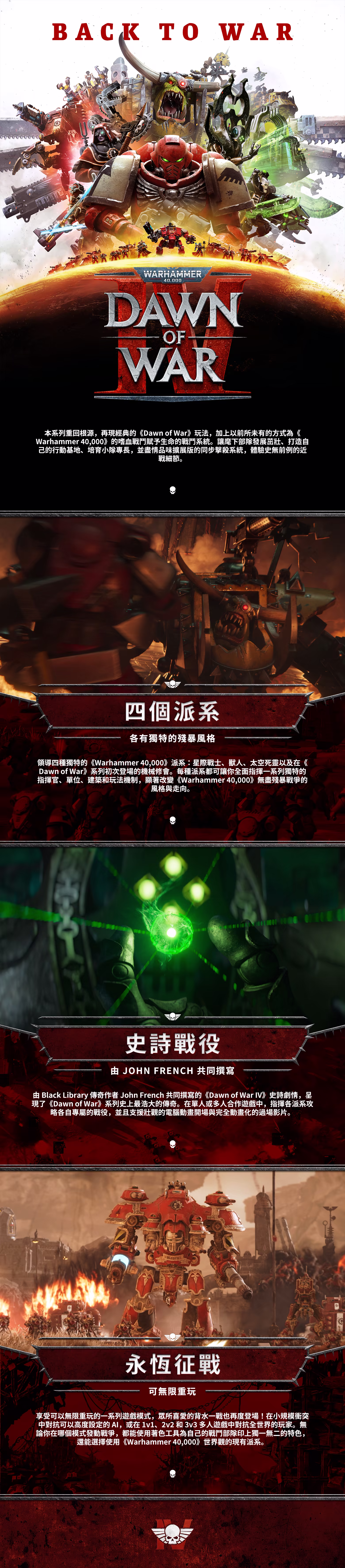 利用成就感十足的戰略玩法,重回這個即時戰略遊戲系列的根源。指揮四種獨特的《Warhammer 40,000》派系,包含在本系列初次登場的機械修會!在超過 70 個史詩戰役任務以及值得一玩再玩的背水一戰 (Last Stand)、小規模衝突 (Skirmish) 與多人模式中奮勇殺敵。