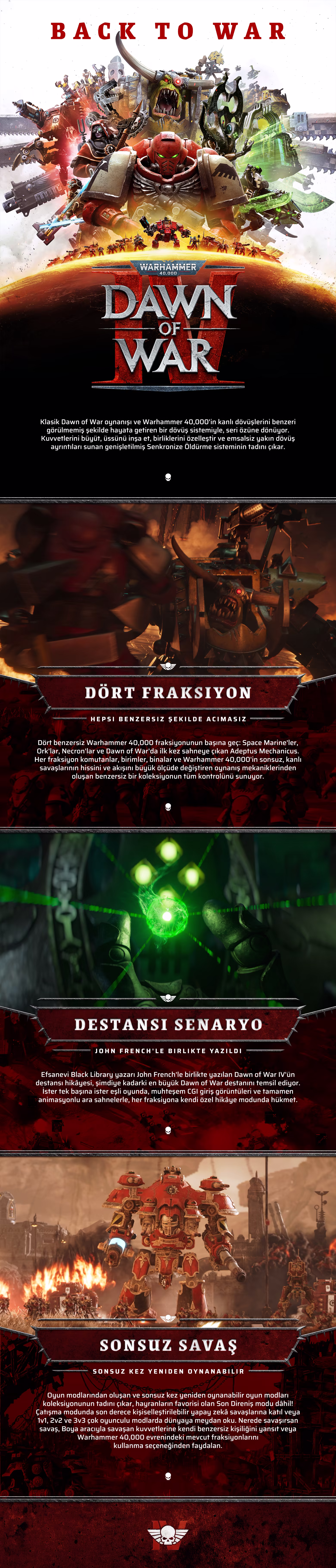 Derin strateji oynanışıyla ünlü GZS serisinin köklerine dön. Seride yeni Adeptus Mechanicus da dâhil olmak üzere dört benzersiz Warhammer 40,000 fraksiyonunu kontrol et! 70'ten fazla epik hikâye görevinde ve tekrar tekrar oynanabilen Son Direniş, Çatışma ve çok oyunculu modlarda savaş.
