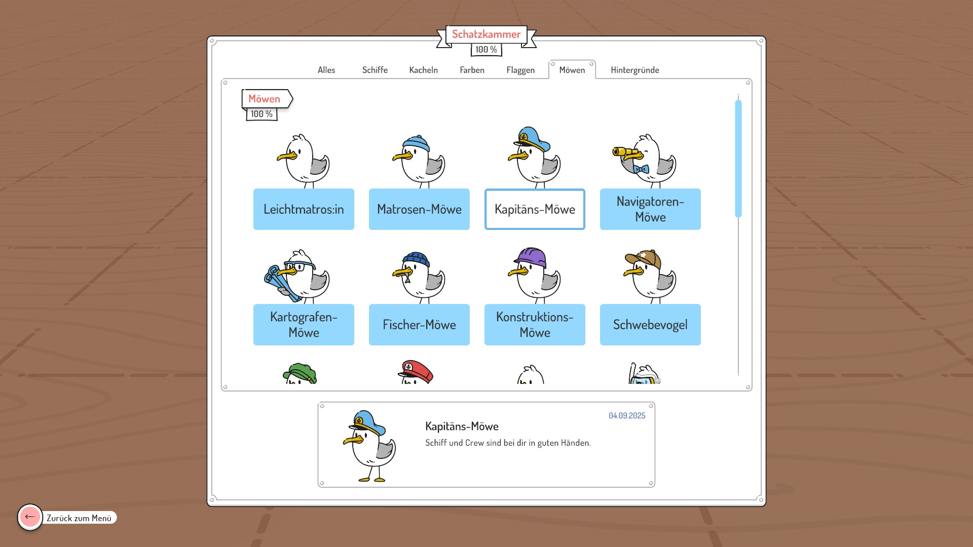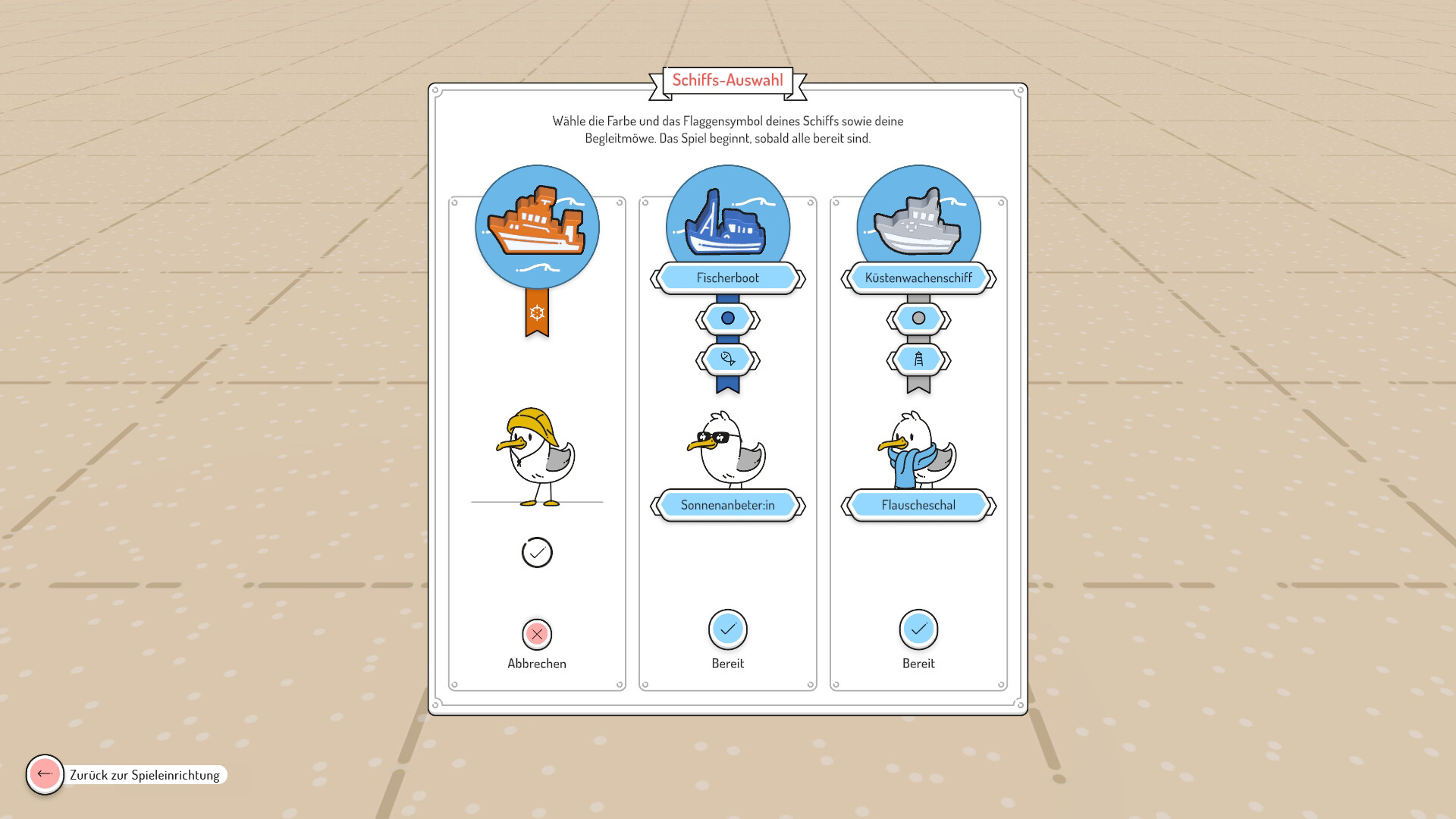 Hisse deine Flagge und wähle eine niedliche Möwe, die dich auf deinen Abenteuern begleitet.