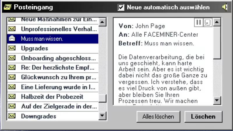 Alleine minen macht keinen Spaß! Erfahre mehr über deine Kollegen und bleibe über das firmeninterne Nachrichtensystem beim neuesten Klatsch und Tratsch auf dem Laufenden. Durchkämme die Nachrichten, um den Mysterien - und den wahren Plänen - der geheimnisvollen Erschaffer der FACEMINER-Software-Suite auf den Grund zu gehen.