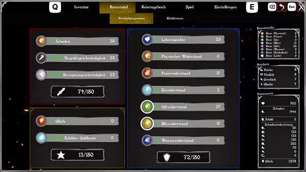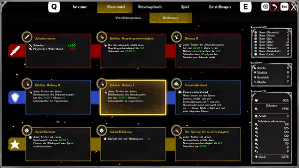 Nutze die Kraft der alten Runen, um deinen Held zu verbessern. An der Runentafel kannst du dir Verstärkungen freischalten und Effektrunen, die du im Untergrund findest, aktivieren. Die zusätzlichen Effekte bieten dir in drei Kategorien nützliche und mächtige Vorteile, deren Einfluss auf den Kampf nicht zu unterschätzen ist. Doch Vorsicht! Wenn du stirbst, fegt der Runenfluch über die Tafel und nimmt dir deine Effekte. Außerdem wird mit jedem Tod ein Effektplatz blockiert, so dass du weniger aktivieren kannst.