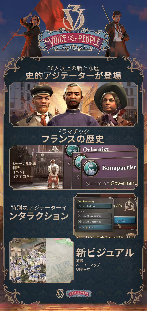 Victoria 3初となるこのイマージョンパックで、19世紀のドラマチックな政治イベントを体験しましょう。改革派、復古派、革命家の間の歴史的闘争に基づいたVoice of the Peopleでは、カリスマ的キャラクターがそれぞれの方針を力強く推し進める中、プレイヤーは高まる政治危機の渦中へと巻き込まれることになります。