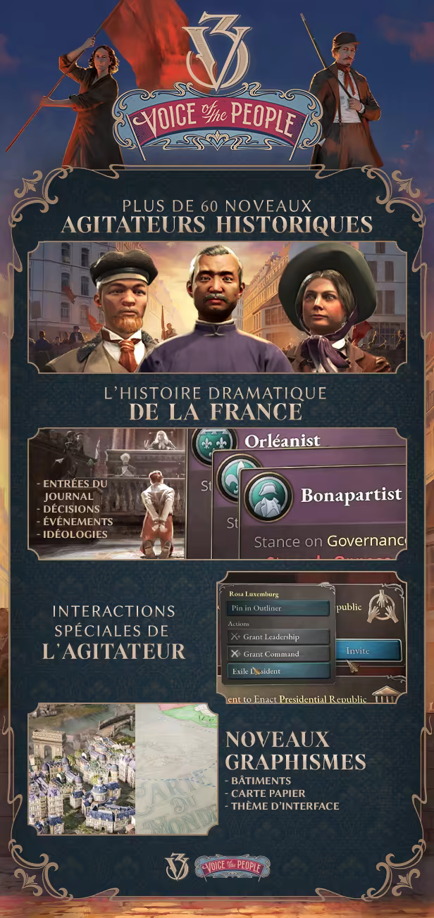 De la maison d'Orléans à la Troisième République en passant par le Second Empire, l'histoire de la France à l'époque de Victoria 3 est marquée de tumultes et d'aventures. L'histoire captivante prend vie grâce à une multitude de nouveaux événements, décisions et extraits de journaux qui racontent le récit de l'un des empires les plus puissants et les plus importants du siècle. Faites valoir les revendications françaises en Afrique du Nord, désignez le vrai souverain de la France ou menez une politique agressive sur le continent.