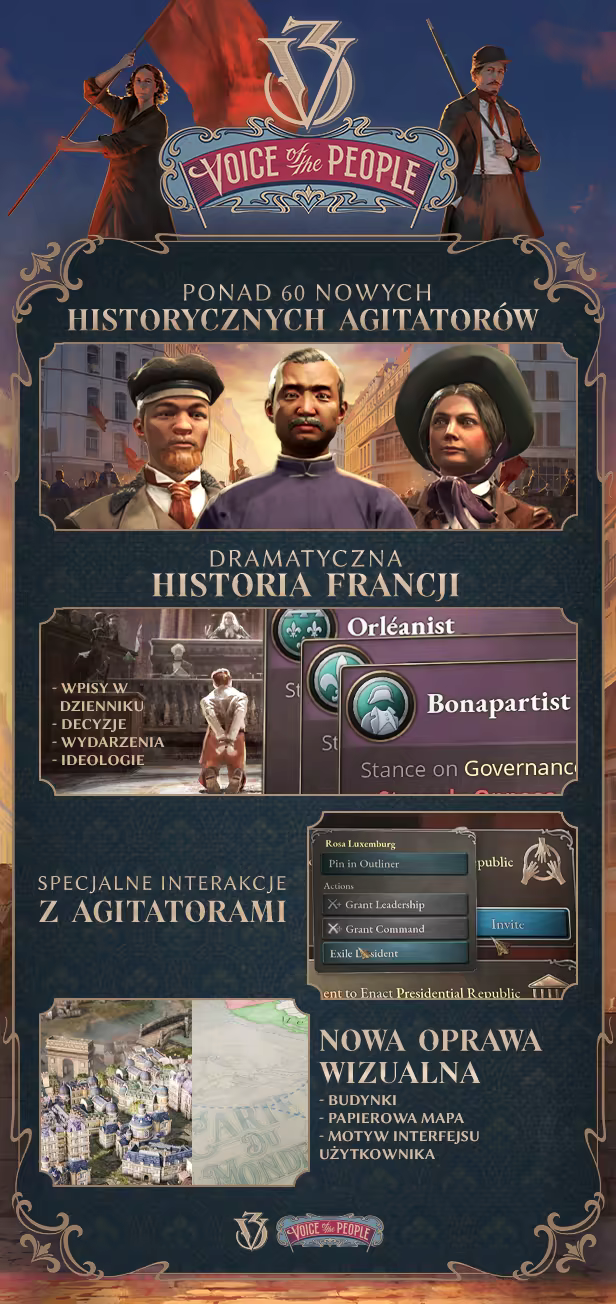 Wróć do dramatycznych wydarzeń politycznych z XIX wieku w pierwszym pakiecie wzbogacającym rozgrywkę w grze Victoria 3. Dodatek Voice of the People przedstawia historyczne zmagania między reformatorami, reakcjonistami a rewolucjonistami. Znajdziesz się w samym środku politycznych kryzysów, do których charyzmatyczne postacie historyczne żywiołowo popchnęły swoje stronnictwa.