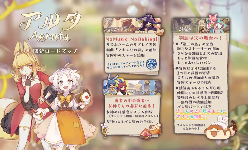 『Aeruta(アルタ)』は、キツネ耳の少女「チャヤ」を操作し、ダンジョンを冒険するアクションパートと、パン屋を経営するシミュレーションパート、二つのゲーム要素を持った2Dドット絵のハイブリッドアクションRPGです。