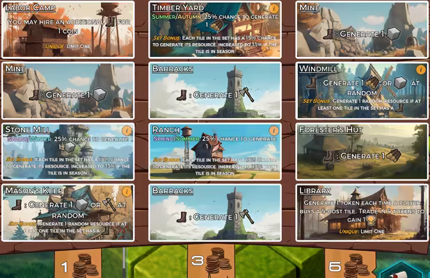 • Tile and Worker Placement - Manage your coins wisely! You get 6 per turn, use them to buy tiles in the Marketplace and hire workers to generate resources used to earn Victory Points!