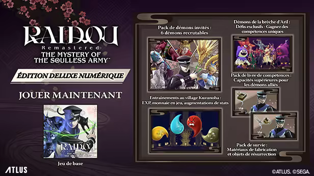 *Ce lot vous permet d'obtenir le jeu de base "RAIDOU Remastered: The Mystery of the Soulless Army" ainsi que le contenu supplémentaire payant à un prix réduit. Veillez à ne pas acheter plusieurs fois les mêmes produits proposés séparément.