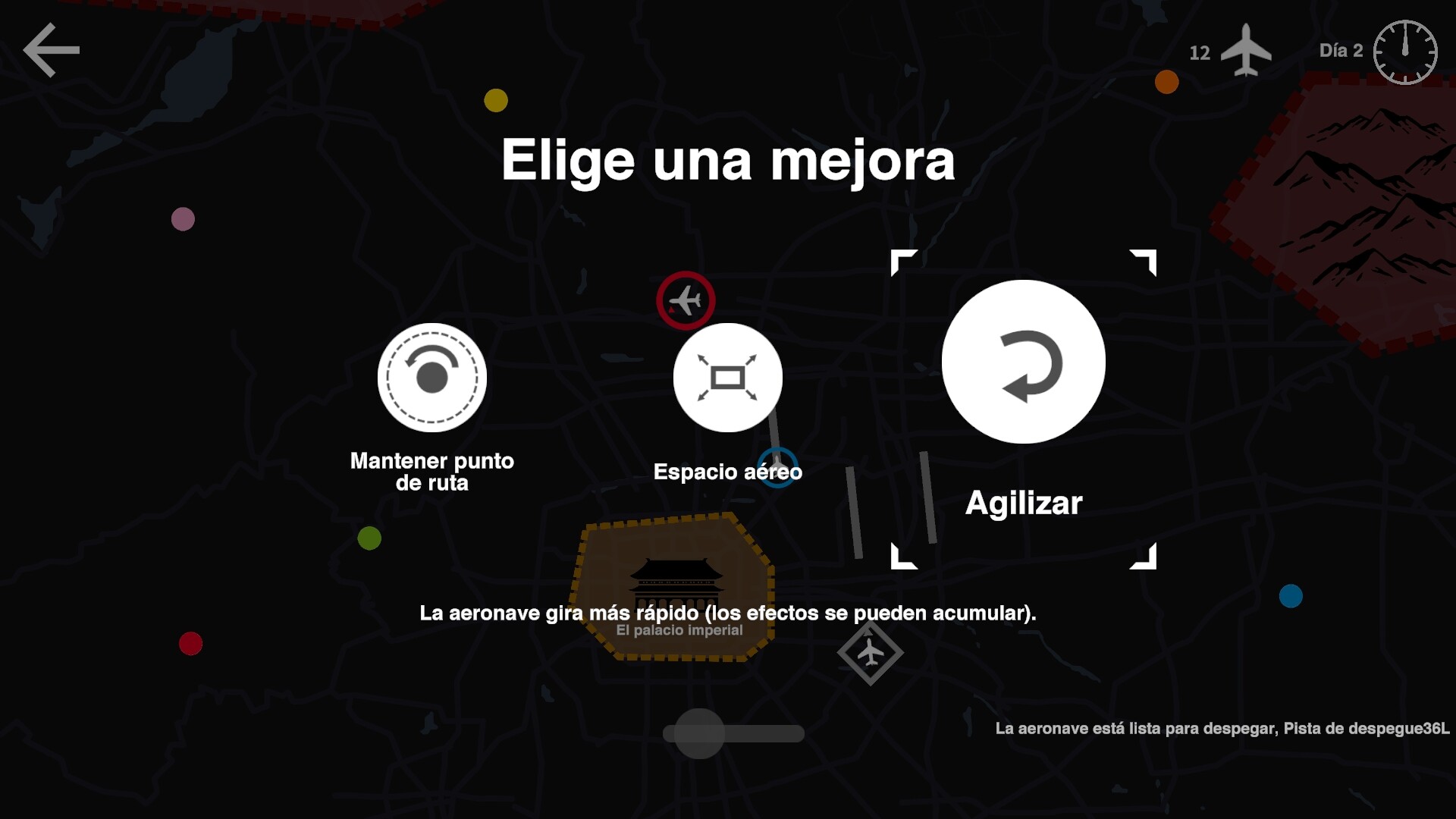 Al finalizar tu día de gestión aérea, podrás seleccionar una mejora para tu espacio aéreo y aeropuerto: retención automática, giros acelerados, aumento del espacio aéreo... ¡Comprender cómo usarlas hará que tu trabajo sea mucho más fácil!