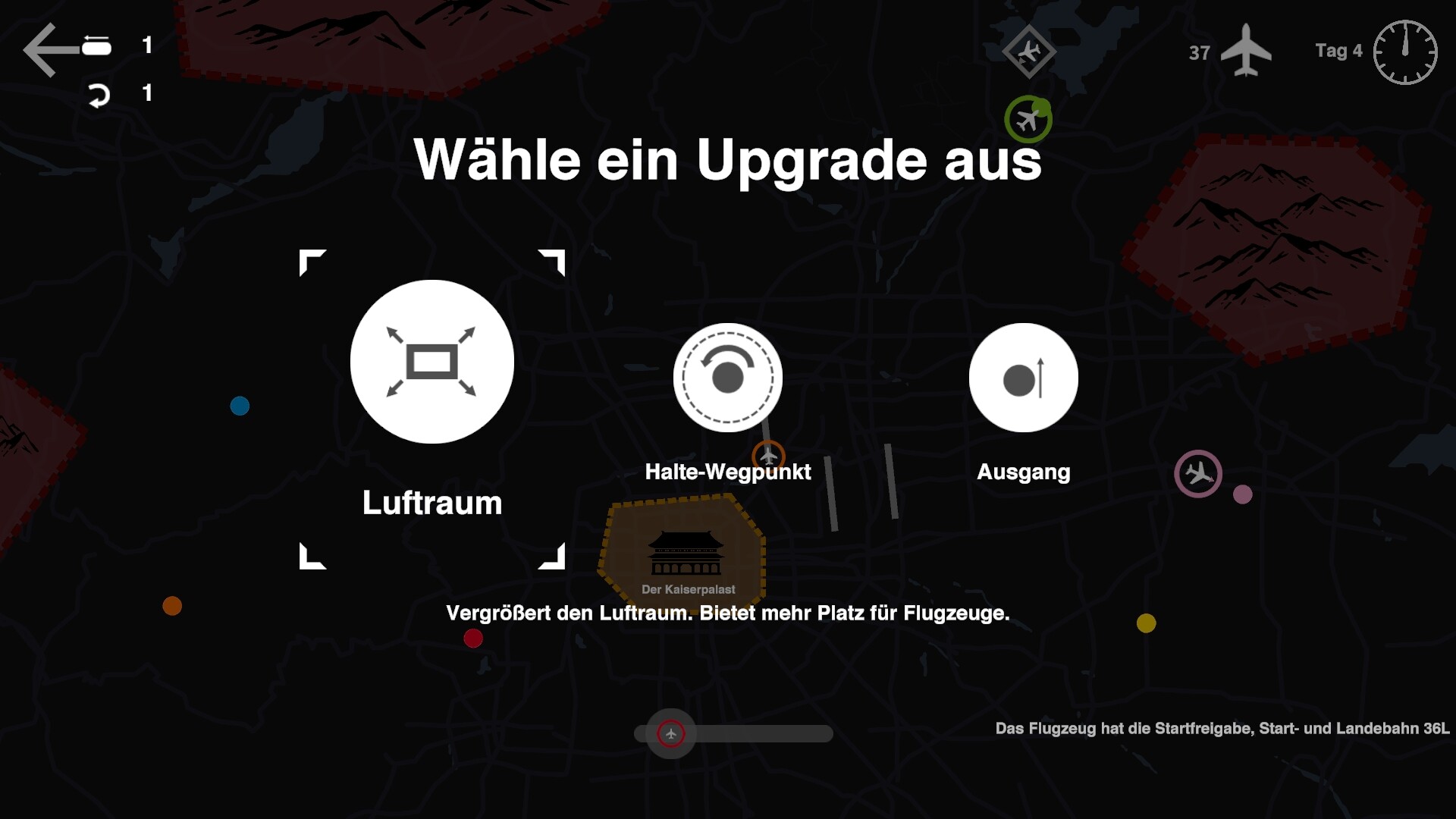 Jedes Mal, wenn du die Verwaltung eines Tages abgeschlossen hast, kannst du ein Upgrade für deinen Luftraum und Flughafen auswählen: automatisches Halten, Beschleunigung in Kurven, Vergrößerung des Luftraums. Setze sie mit Bedacht ein, da sie deine Arbeit erleichtern.