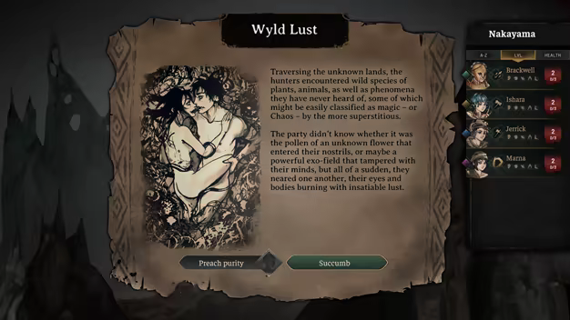Before each skirmish, you will resolve a series of events that may turn the incoming battle into a walk in the park… or a one-way visit to hell. Before you decide which path to take, take your hunters’ stats, traits, traumas – and even genders! – into consideration. After all, you wouldn’t want to enter a fight blind, would you?