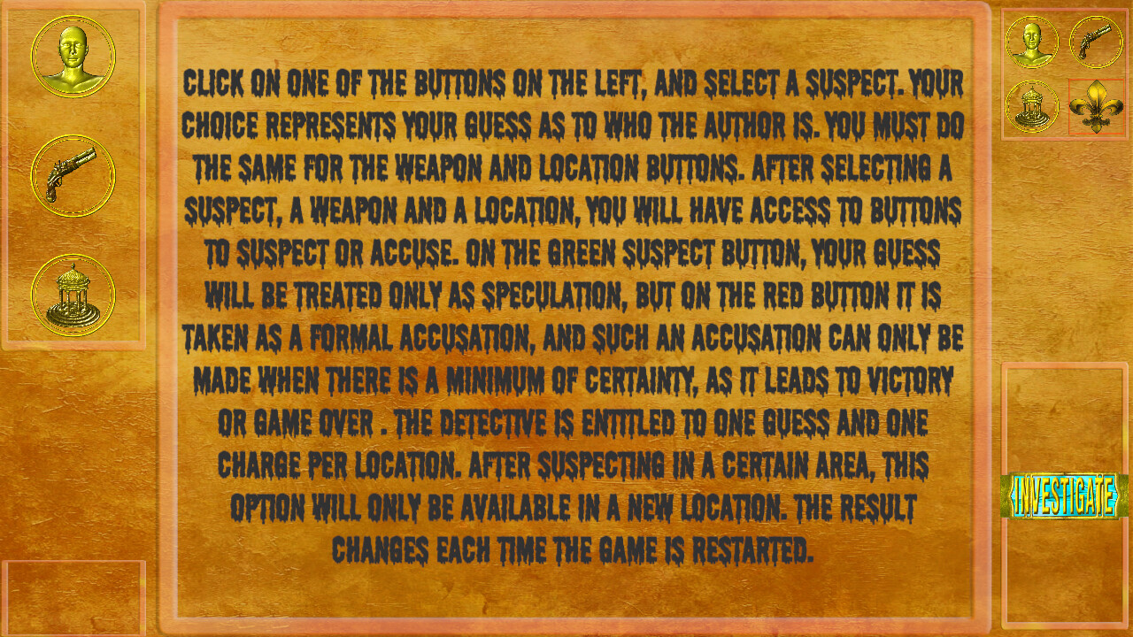 * When opening the panel, select a suspect, a weapon and a location, this information will represent your guess, then click on the suspect button, eliminate possibilities until you solve the case, when you have all the information just make the accusation by clicking on Accuse.