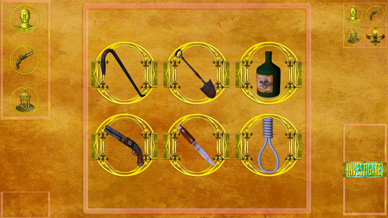 * How to play: In this game, the player plays a detective, and must look for clues in the scenario. Usually the clues are inside the towers, and where there are no clues there can be the ghost. When finding a clue, a location on the map will be released, in this location the player will be able to access the panel to "Accuse" or "Suspect" about who was the murderer, what was the weapon used and the place of the crime. Without the clue, the place remains haunted by the ghost of the Bride. If you don't intend to suspect or accuse, just click on Investigate to close the panel and go look for other clues.