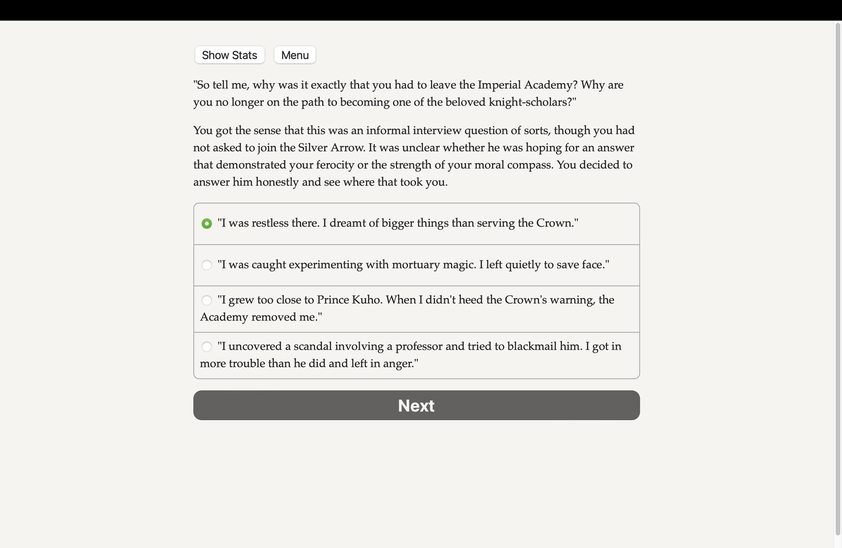 Undying Fortress is an interactive dark epic fantasy novel by Yeonsoo Julian Kim, author of The Fog Knows Your Name, where your choices control the story. It's entirely text-based, 500,000 words and hundreds of choices, without graphics or sound effects, and fueled by the vast, unstoppable power of your imagination.