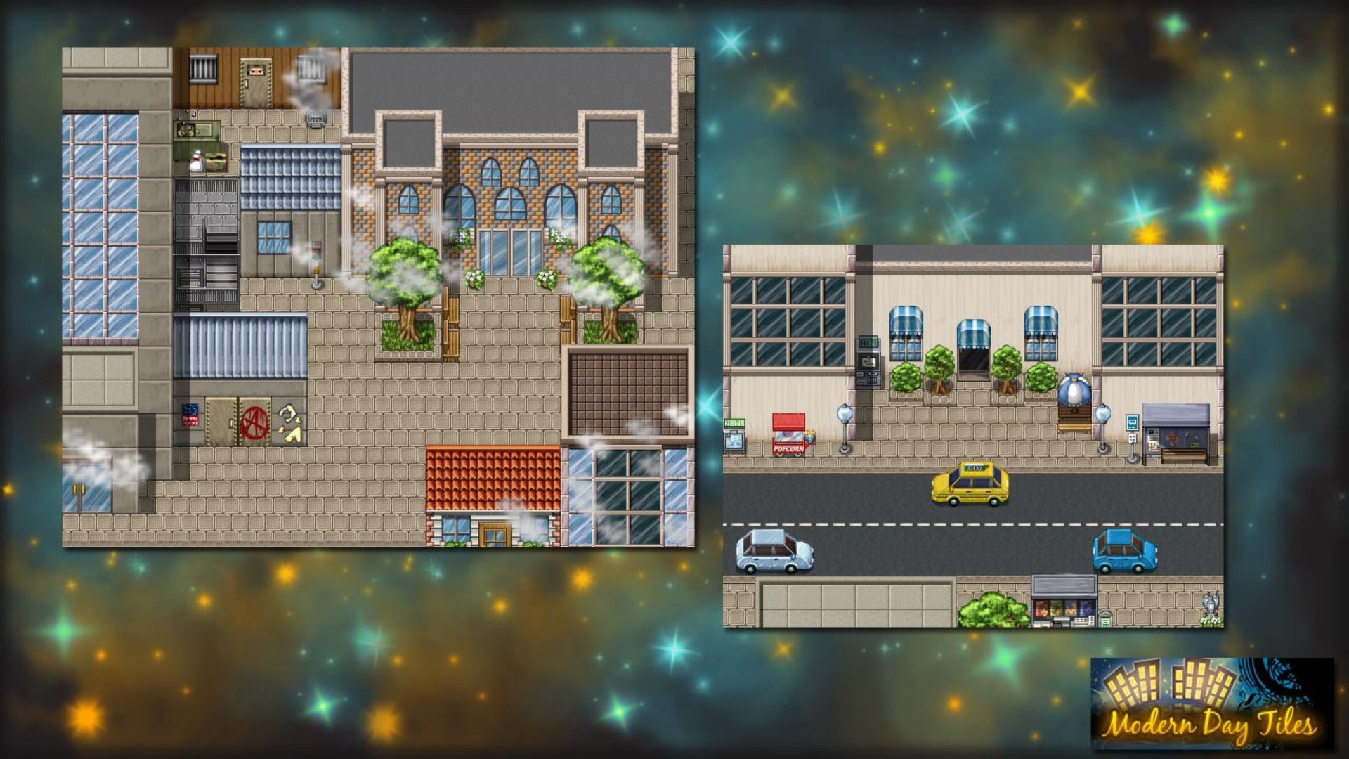 Dreaming of building a sprawling modern city? How about a modern apartment for your hero? With Modern Day Tiles Resource Pack, all this is possible - and more! Add a bit of modern flair to your games with everyday objects and technology. Create urban zones and pleasant homes in a style that complements RPG Maker VX-Ace's default art.