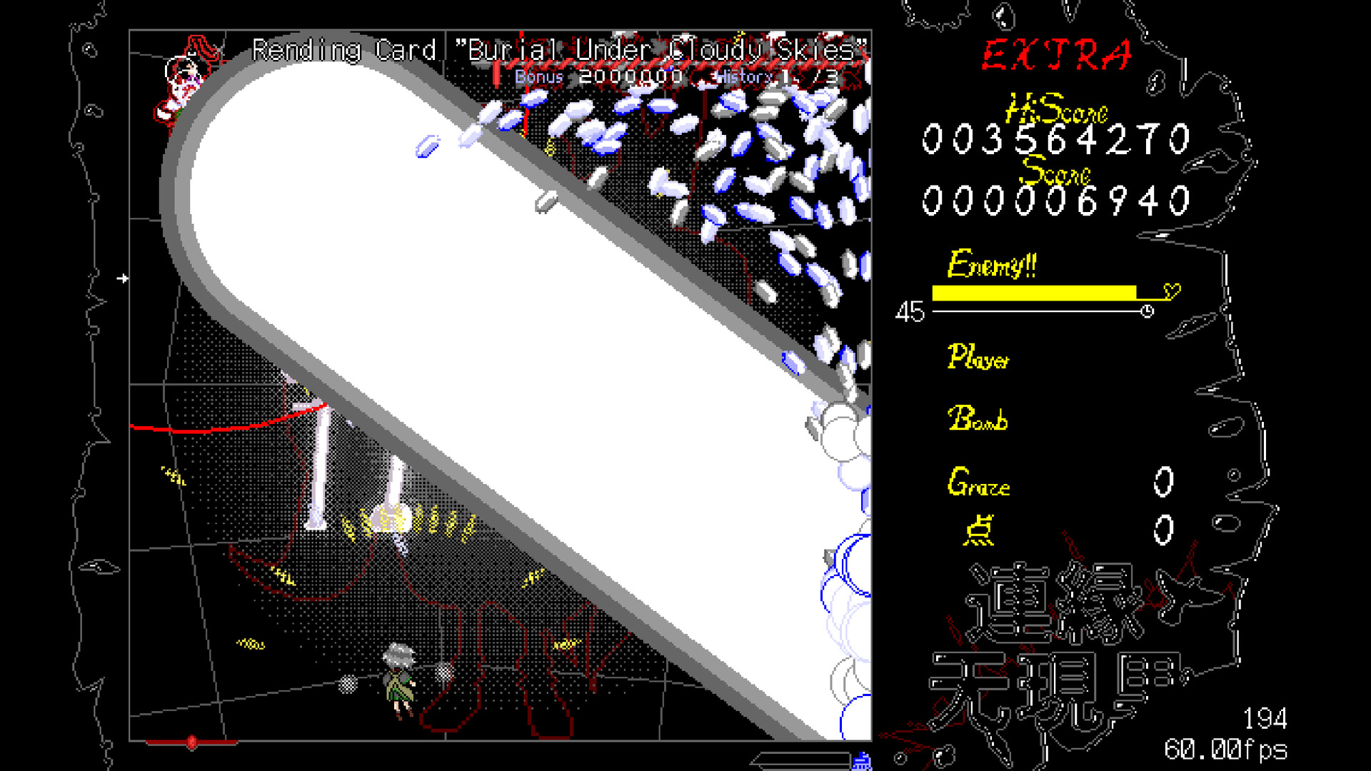 Features two full length extra boss fights against Tsurubami Senri with 54 unique spells and nonspells and three difficulty levels for new and experienced players. Save replays and practice spells as you discover them to go for high scores. The difficulty is uncompromising, but if you're having trouble you can even the odds by setting your starting lives and using continues.