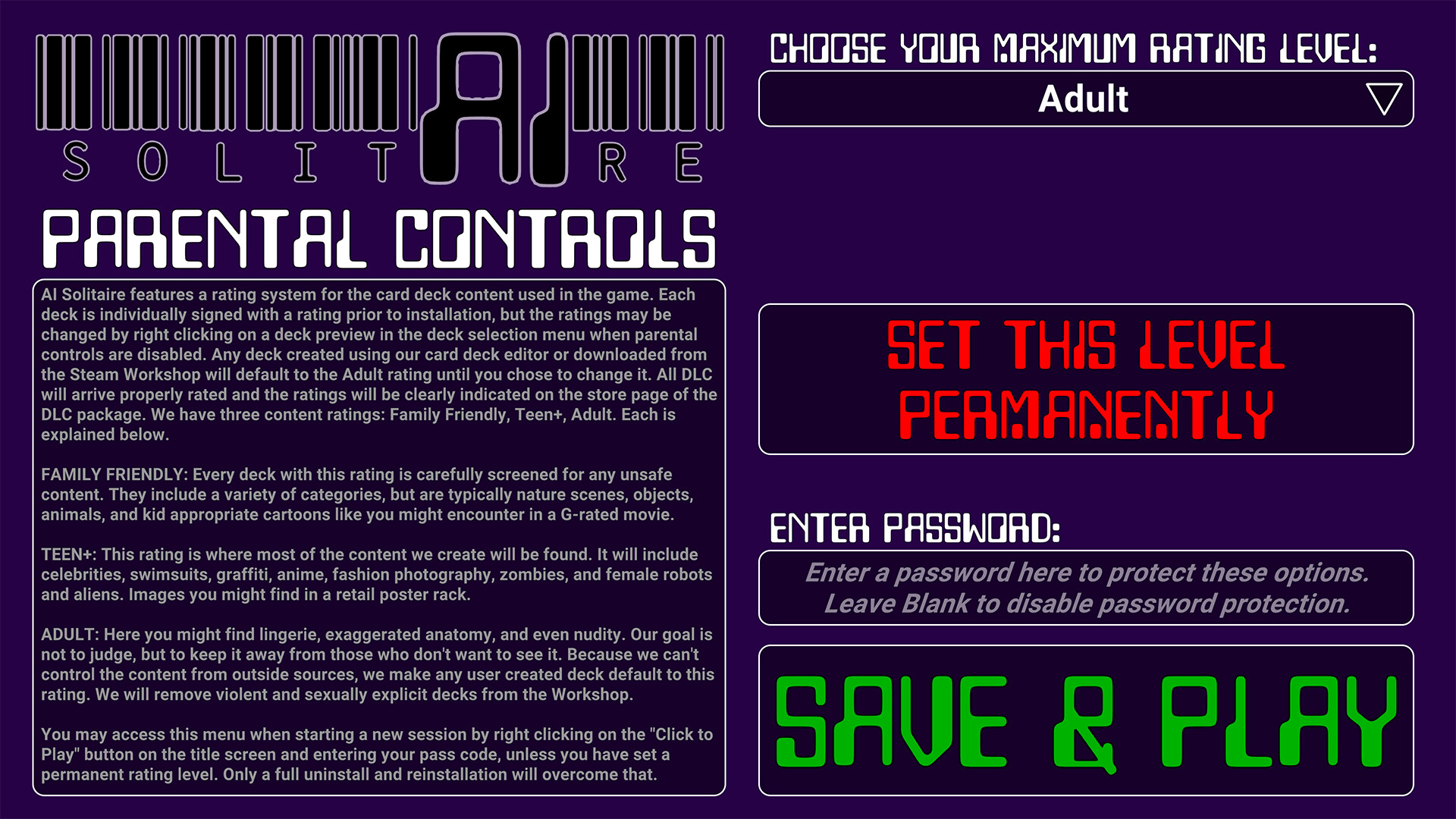 The first time you run AI Solitaire you will be directed to the Parental Controls menu. There you can set the allowable content level that will be seen in the game. You may protect these settings with a password, or you can permanently change them so that they can only be changed by uninstalling and reinstalling the game.