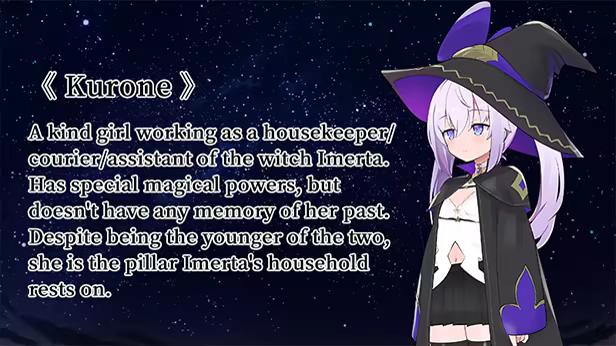 Kurone's Feelings ~Apprentice Witch of Starfall Village~ follows a girl who has lost her memories as she gradually develops human "feelings" and stumbles through various mishaps while doing her best to assist the witch of a small village in helping the locals.