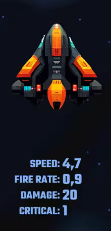 "Galactic Gladiators" is a 2D top-down shooter game. You control a spaceship and face off against hordes of enemies as you progress through levels. At each level, you can choose a card that will grant unique abilities to help you defeat your opponents. Additionally, you can collect crystals to upgrade your ship or buy a new and more powerful one. The ultimate goal is to get as far as possible, defeating bosses and facing increasingly challenging obstacles. Test your combat skills in space with "Galactic Gladiators".