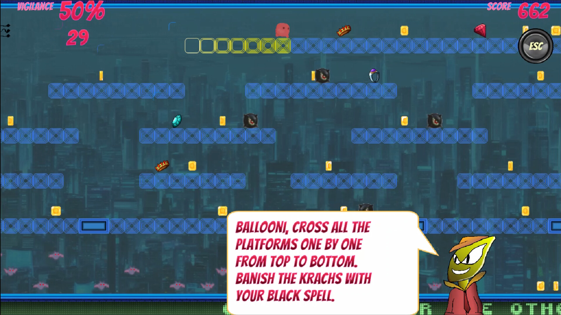 Ballooni runs and jumps through crackling, colorful levels, firing his magic with precision.