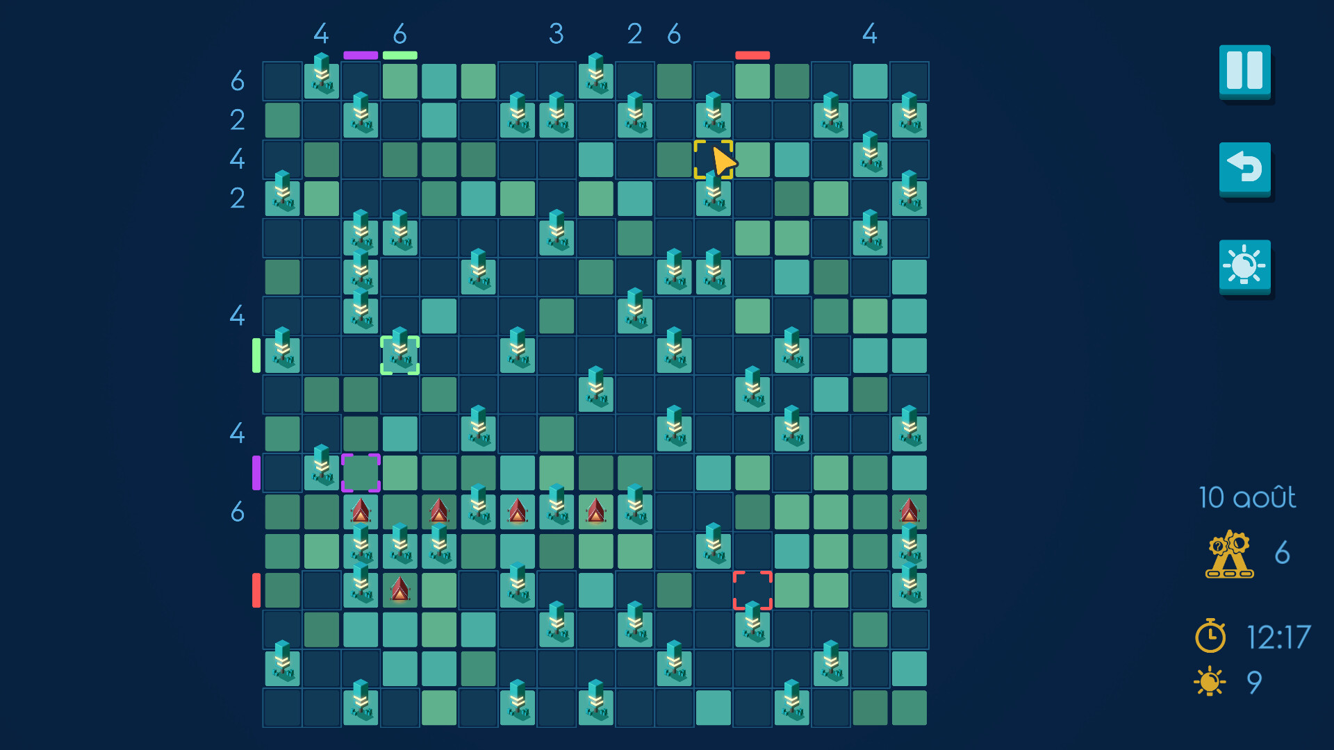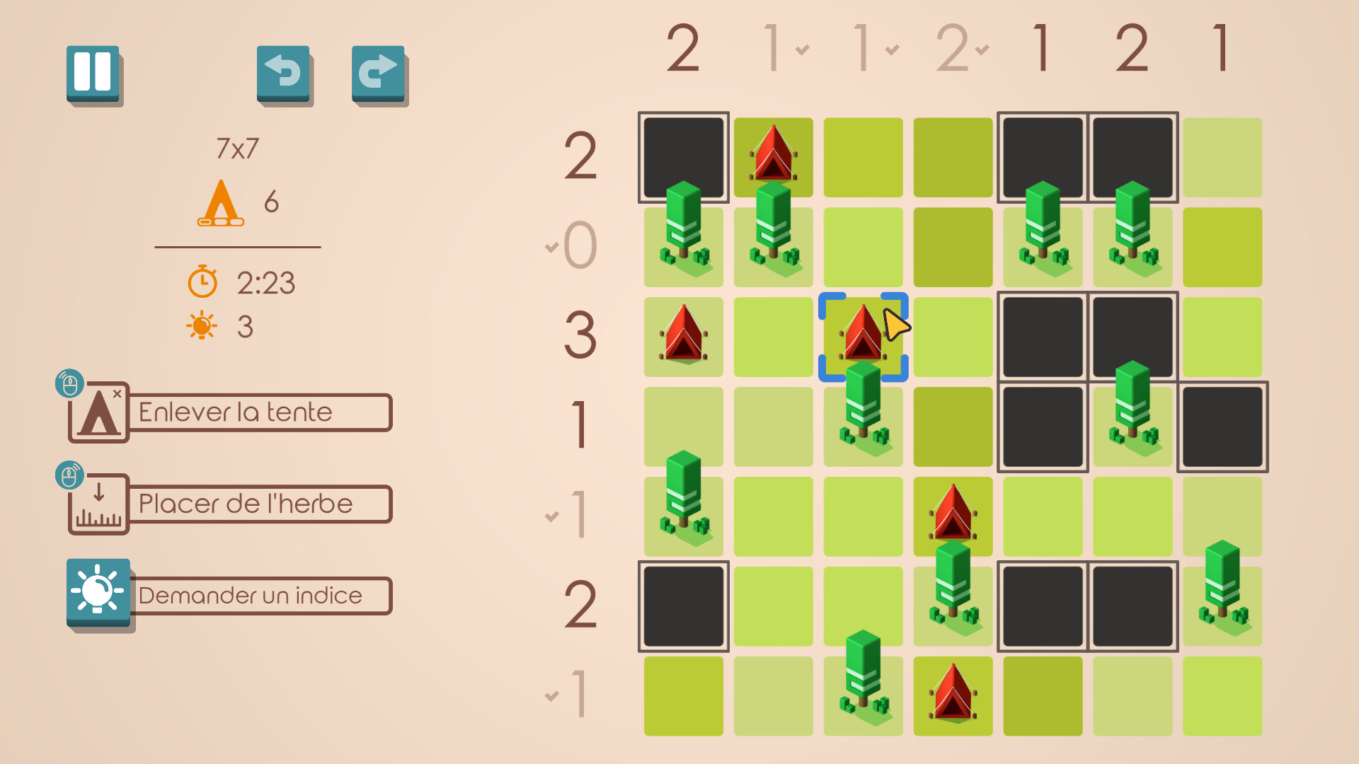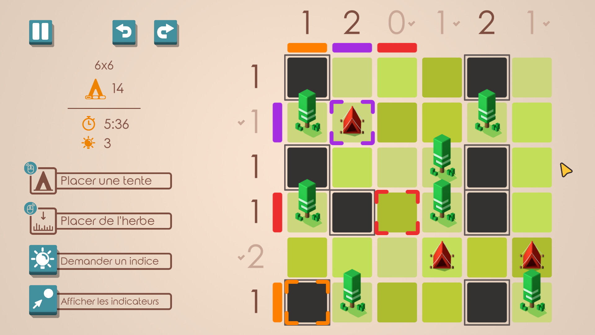 Votre mission est simple: placez des tentes à côté des arbres dans une grille de nature. Les nombres autour de la grille vous indiquent combien de tentes doivent être placées dans chaque ligne et colonne, mais faites attention: les tentes ne doivent pas se toucher. Chaque niveau a une solution unique, alors prenez votre temps et planifiez soigneusement chacun de vos coups.