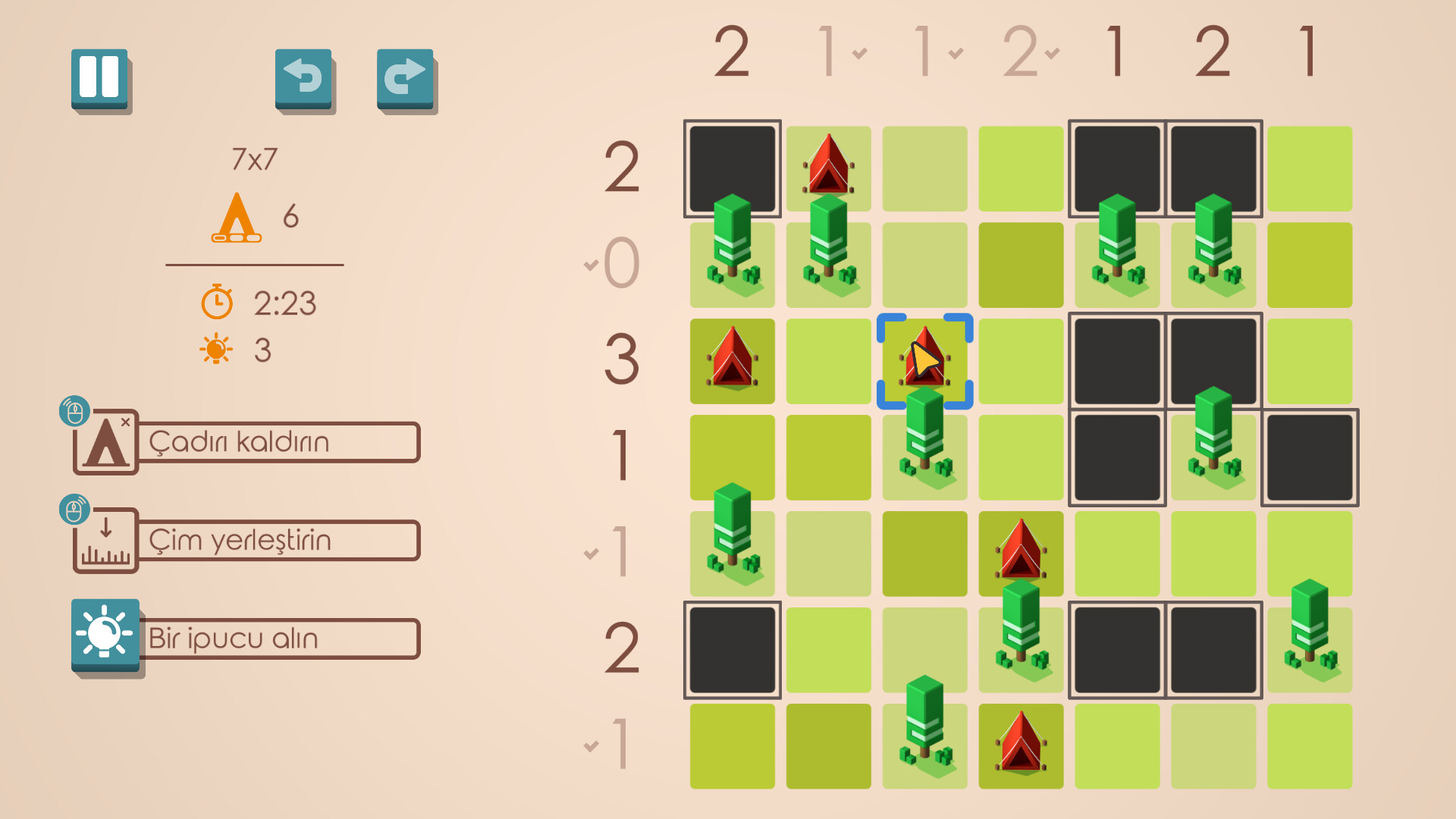 Büyük karenin etrafındaki sayılar, her sıraya ve sütuna yerleştirilecek çadır sayısını söyler. Dikkatli olun, çadırlar birbirine dokunamazlar.