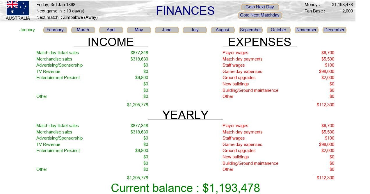 Starting in 1868 (Year of the first Australian touring team to England, the Australian team was entirely comprised of Aboriginals for this tour) you will take your country on a year long journey to play each other test team once at home, and another time away.