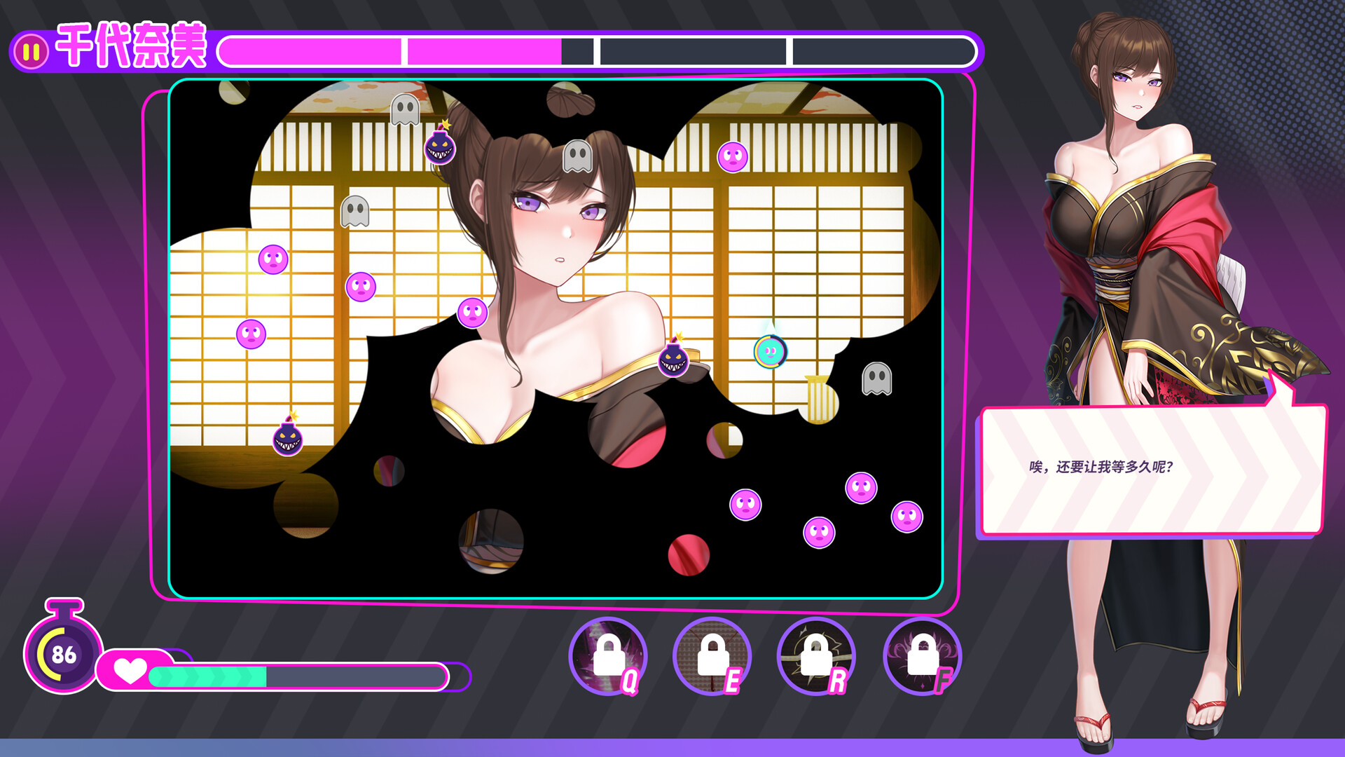 通过你的行动,消除盖在美少女身上的黑色色块。当色块被消除后,美少女会感谢并报答你。