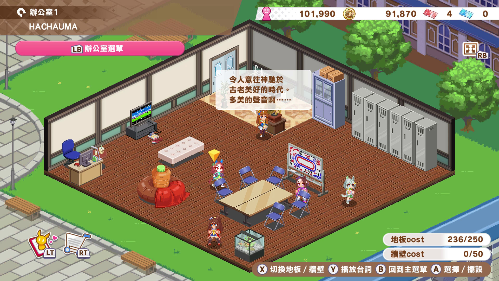 除了可享受每支隊伍風格的「故事模式」,還有可自由布置喜歡的賽馬娘與家具來打造個人專屬辦公室的「辦公室模式」,更有可選擇本地或線上,並且最多四人對戰的「對戰模式」。無論是獨樂樂還是眾樂樂,都能讓玩家盡情感受遊戲樂趣。
