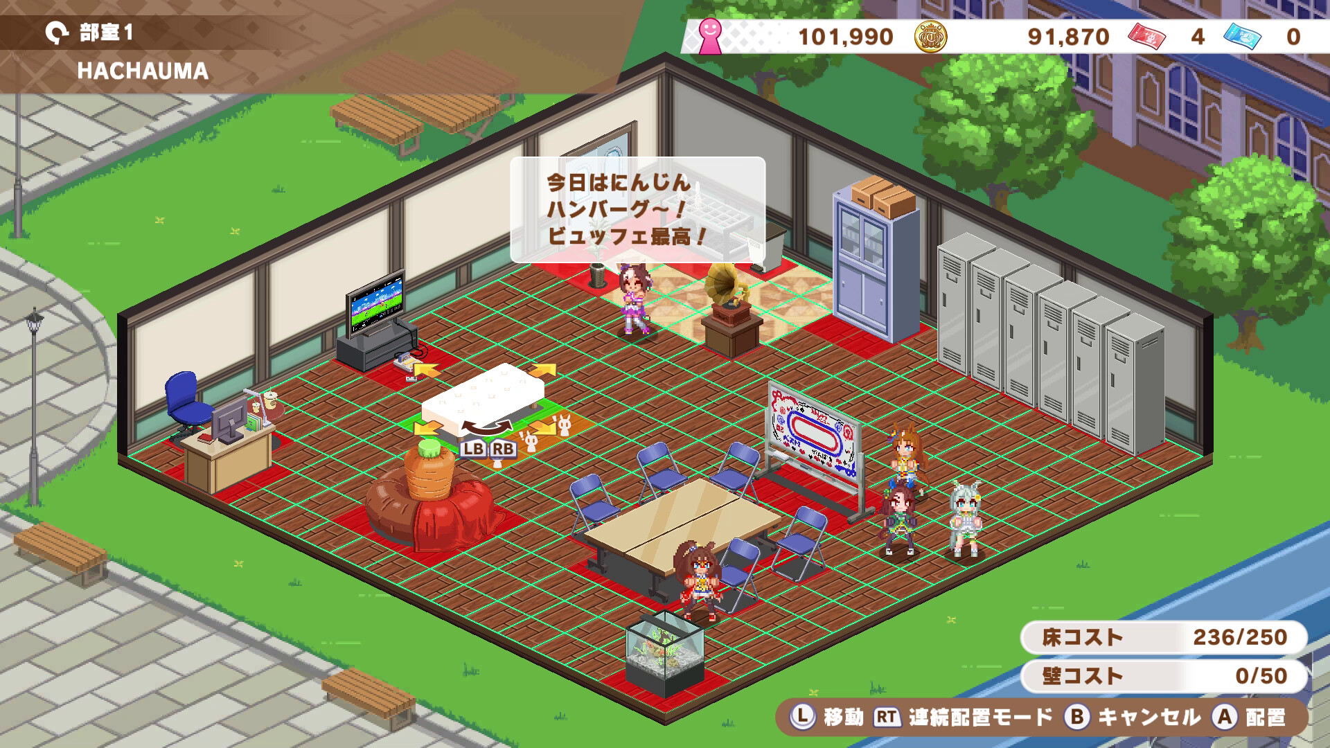 それぞれのチームの個性を楽しめる「ストーリーモード」をはじめ、好きなウマ娘や家具を配置して自分だけの部室を作成できる「部室モード」、ローカルでもオンラインでも最大4人でバトルを楽しめる「対戦モード」があります。ひとりでも、みんなでもワイワイ楽しむことができます。