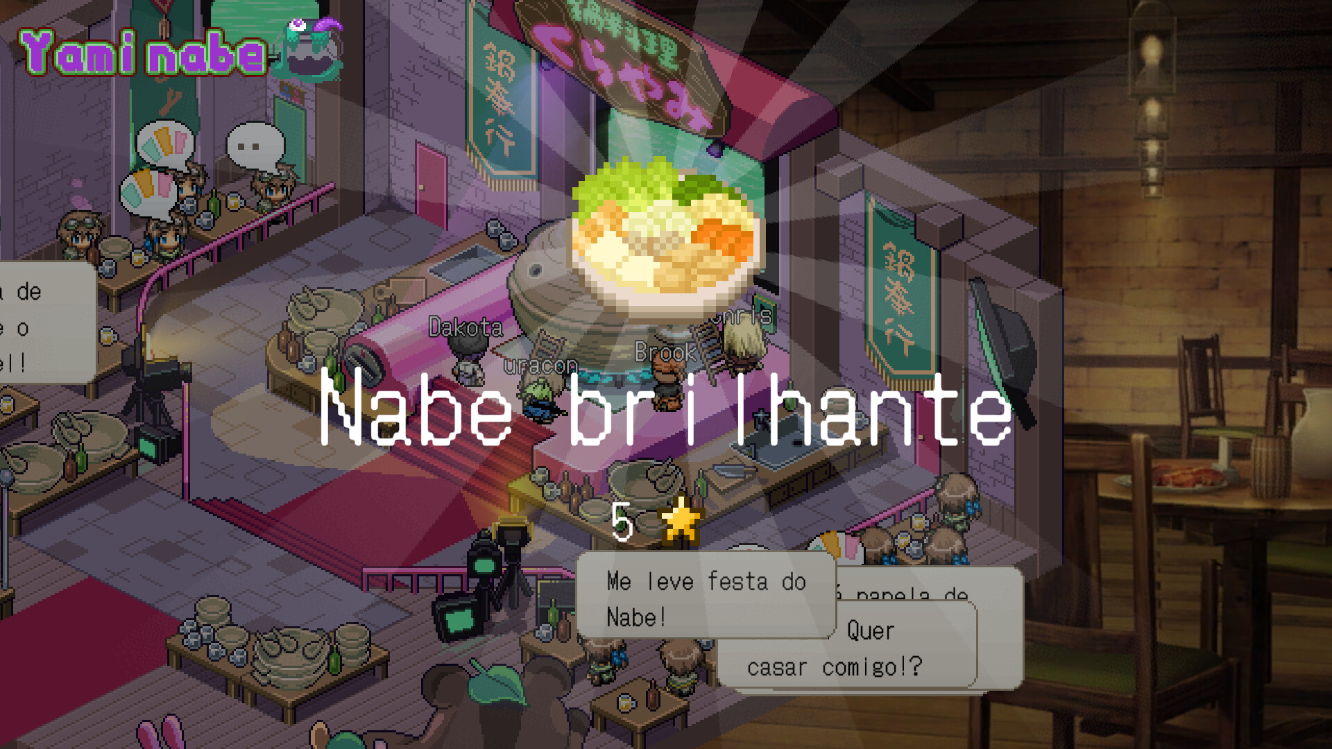O Yami Nabe é um jogo de identidade oculta em que todos trabalham juntos para criar uma Panela de Nabe. Visite as masmorras com seus colegas de equipe e colete ingredientes exóticos para preparar o mais delicioso Nabe. Mas cuidado - nem todo mundo é o que parece. Um espião se esconde entre vocês, para arruinar sua obra-prima culinária. Você consegue separar os chefes dos impostores? Desvende o mistério e se esforce para obter o melhor banquete!