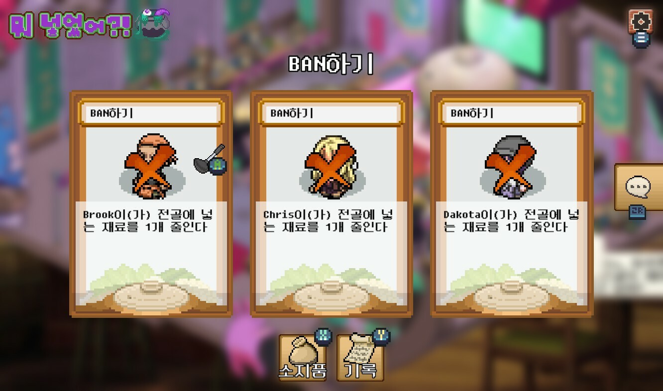 먼저, '직원' 팀의 목표는 맛있는 전골을 끓이는 것이죠. 던전에 가서 모은 재료와 부적을 잘 조합해서 점수가 높은 전골을 만들어 보세요. 또한, 전골에 재료를 넣기 전에 다른 플레이어 한 명을 BAN할 수 있어요. 이렇게 하면 전골에 넣는 재료가 줄어드니, 의심 가는 플레이어로부터 전골을 지킬 수 있지요.