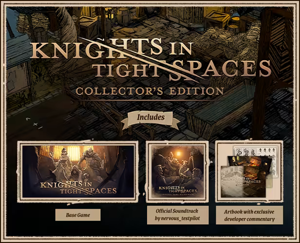 Bevat 3 items: Knights in Tight Spaces, Knights in Tight Spaces - Official Game Soundtrack, Knights in Tight Spaces - Artbook
