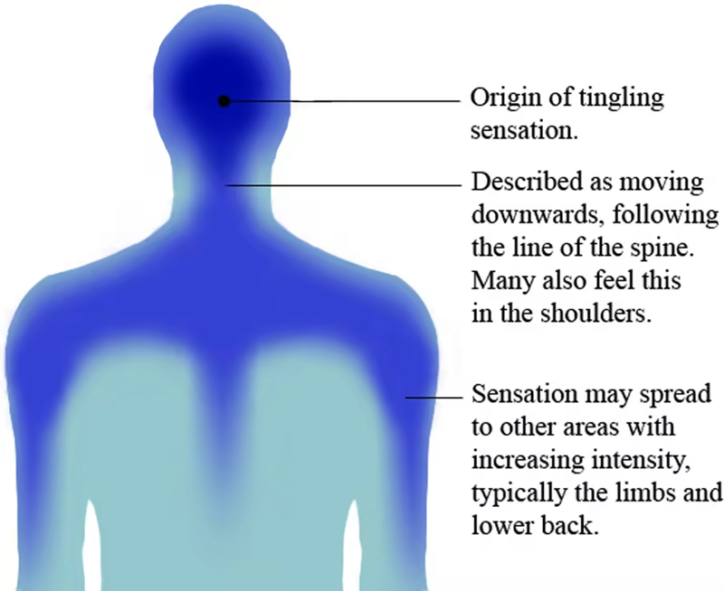 An autonomous sensory meridian response (ASMR) is a tingling sensation that usually begins on the scalp and moves down the back of the neck and upper spine. A pleasant form of paresthesia, it has been compared with auditory-tactile synesthesia and may overlap with frisson. ASMR is a subjective experience of "low-grade euphoria" characterized by "a combination of positive feelings and a distinct static-like tingling sensation on the skin". It is most commonly triggered by specific auditory stimuli, and less commonly by intentional attention control.