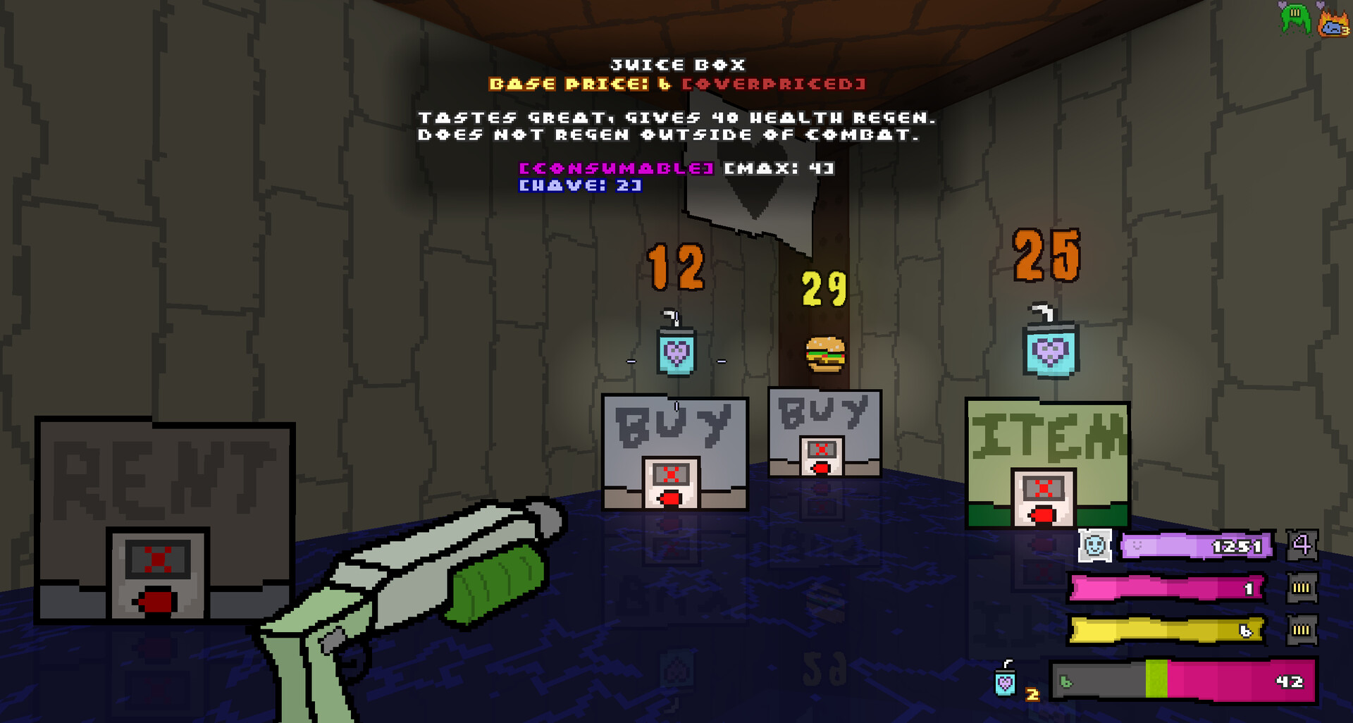 The shop contains everything you need to help you survive, at prices you cannot afford. Here, you can find health, weapons, armor, consumables, powerups, and passive upgrades. Each purchase from the shop increases that item's future prices, so if you're not careful, you may soon find yourself with empty pockets, and a mountain full of debt.