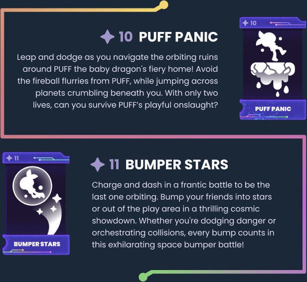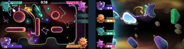 Each of our 12 Gravity Games feature their own unique bite-sized challenge where up to 4 players can compete. Eject your friends into space as you race across gravity fields, score a goal with an entire moon, leap across planets to escape a black hole, capture and hold zodiacal constellations and much more!
