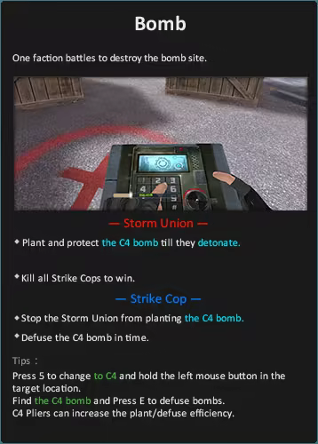 Geleneksel FPS oyun özelliklerine dayalı olarak, aralarında klasik modların da bulunduğu bir dizi oyun modu oluşturduk: Patlayıcı Savaşı, Takım Savaşı vs.