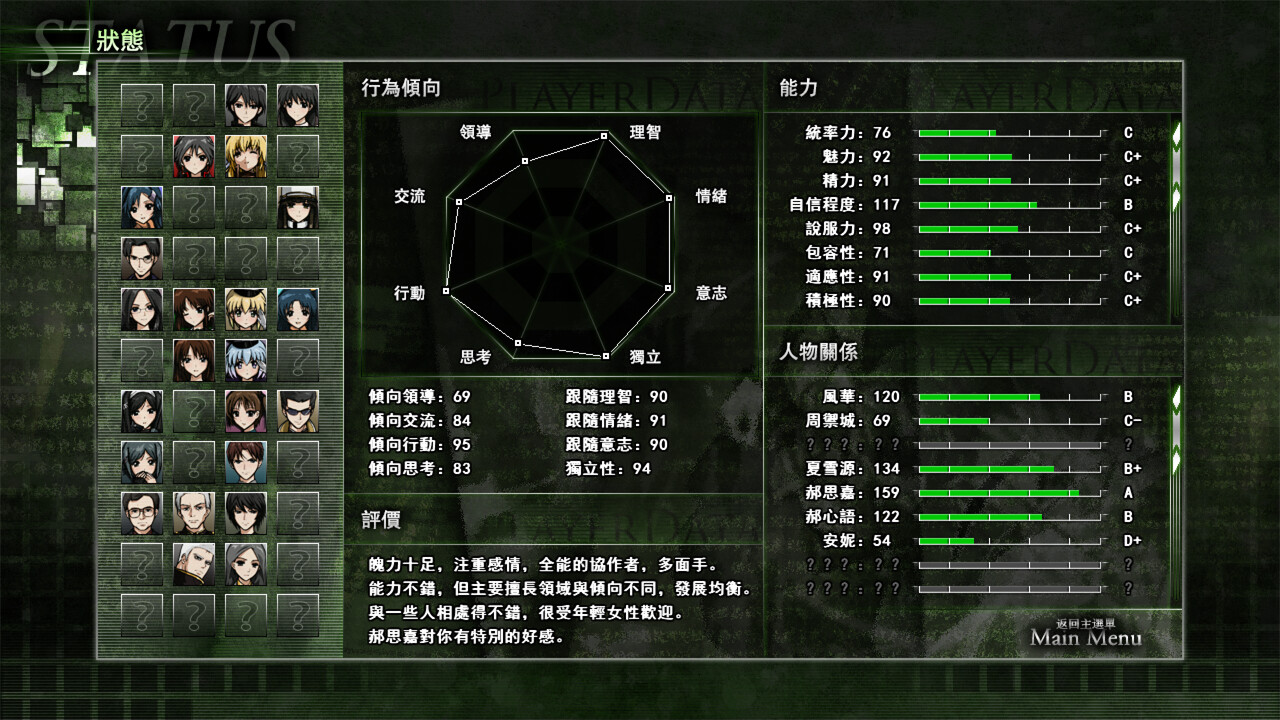 · 有趣的性格測試系統:當您做出選擇時,AI會對資料加以整合,生成性格測試報告。整個遊戲就是測試的過程,您可以即時查看狀態面板,瞭解您的測試結果。