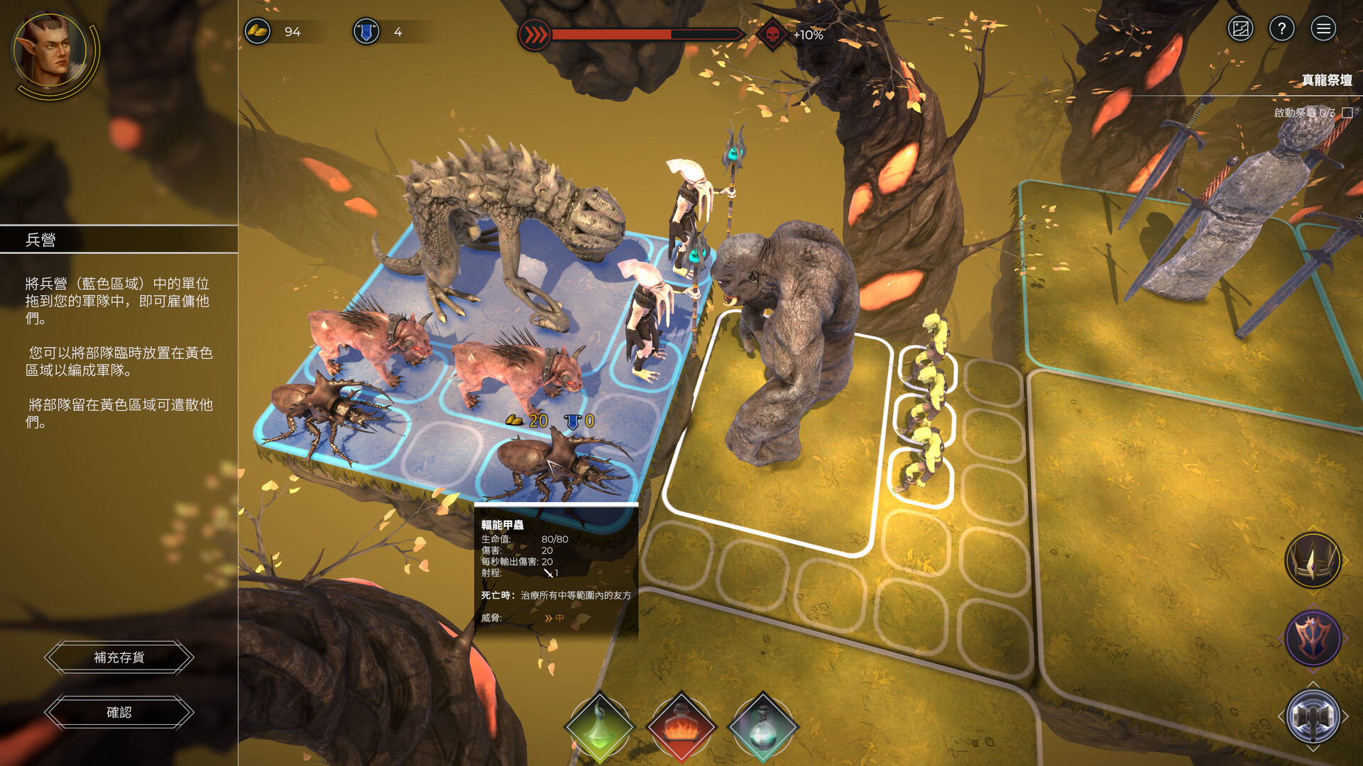 合理釋放的法術可以迅速消滅敵方部隊,或是拯救你的部隊於水火。法術在遊戲中至關重要,但請記住:每個法術都是一次性的,而且能隨身攜帶的數量也極為有限。你必須謹慎選擇使用時機。