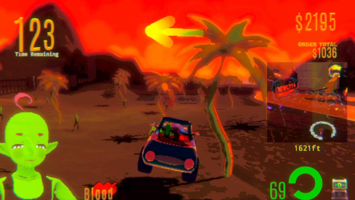 Heck City Delivery is an arcade driving game inspired by Crazy Taxi. You play as a delivery goblin in the post-apocalypse, delivering food in your blood-powered car to the demons who inhabit Heck City, 20XX. Make your deliveries quickly and earn enough money to pay your rent!