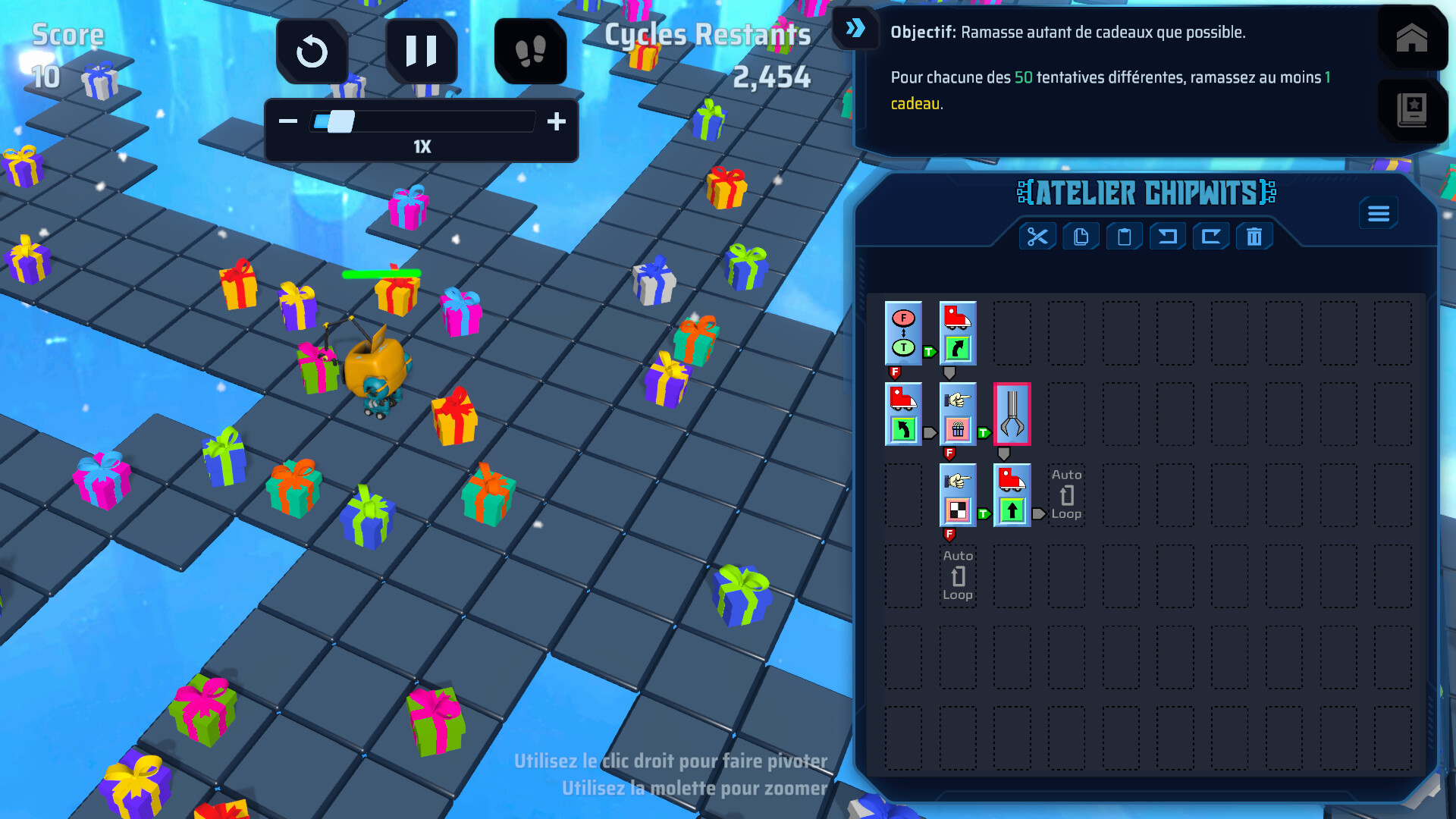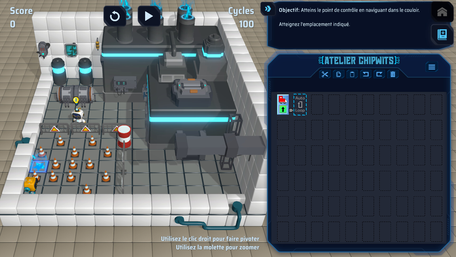 Prends le contrôle d’un robot modeste, le ChipWit Modèle CW-03.24, et apprends les ficelles de l’automatisation de ses activités. Place des puces pour apprendre à ton ChipWit les déplacements sur le sol de l’usine, en t'appuyant sur les compétences acquises à travers les domaines précédents pour résoudre des énigmes de plus en plus complexes et aider le Professeur Chip à ouvrir sa première usine. Organise ces puces pour trouver la solution à chaque étage, puis appuye sur Jouer pour regarder ton ChipWit accomplir son objectif !