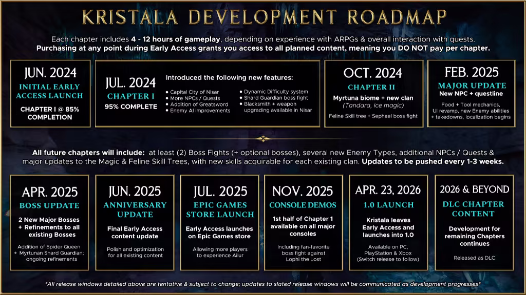 “Kristala will remain in Early Access for approximately 18 months, though timing may shift based on player feedback and development progress. During this time, the game will be released in Chapters.
