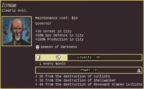 Governors can be assigned to cities to reduce unrest and increase productivity. Some of them can also issue temporary edicts such as declaring martial law, hosting a masked ball, or using the citizens for gruesome experiments. Others can get rid of monsters or pirates for you. All for a price.
