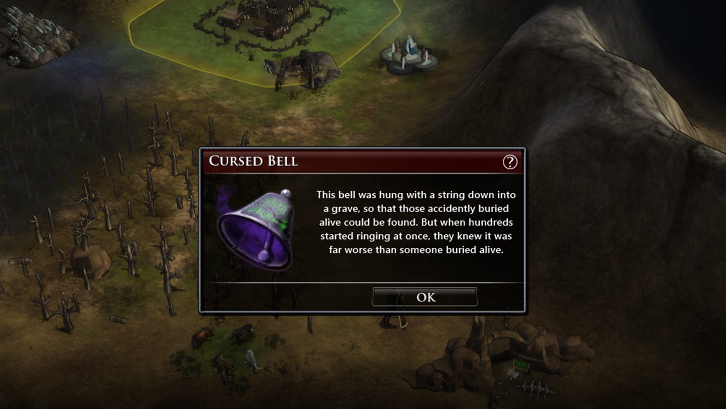 New treasure is available to be found in this third DLC for Fallen Enchantress: Legendary Heroes. Explore abandoned graveyards and you may find a Cursed Bell which can be rung at desperate moments in battle. Treasure chests may contain a Staff of the Serpent or a piece of Blood God armor. Design your custom sovereign with a Revenging Ring, Bunny Slippers and other new items.